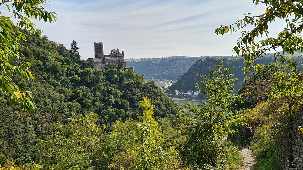 Wo es rauf ging, geht es auf dem Rheinsteig bekanntermaßen auch immer wieder runter (und ja – leider auch andersrum). Und so steigen wir nun hinab nach Wellmich. Dabei erhaschen wir schon einen ersten Blick auf Burg Maus.