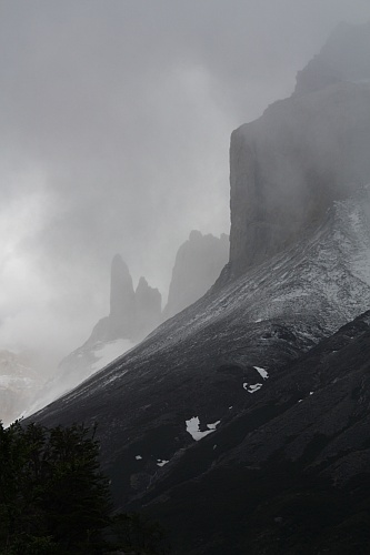 Noch vor dem Mirador beschließen wir daher, es dabei bewenden zu lassen und uns lieber auf den weiteren Weg zu machen. Auch hier laufen wir wieder eher durch Bachläufe – da der Untergrund allerdings jetzt aus Waldboden statt aus Steinen besteht, ist entsprechender Matsch vorprogrammiert. Wir bewundern insbesondere zwei Mitwanderer, die jeweils in (vormals) schneeweißen Hosen wandern – sie geben ein sehr interessantes Bild ab. Das Wetter hält sich hartnäckig und so sind wir froh, die Torres bereits am zweiten Tag und bei gutem Wetter gesehen zu haben. Heute sehen sie eher trostlos aus.