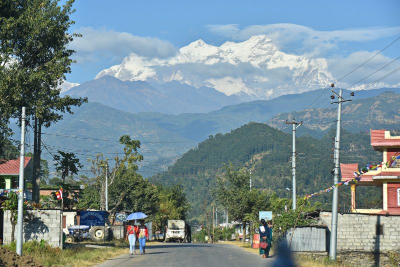 Als wir ins Hotel zurückkommen ist klar: ein Fahrer ist gefunden, es kann losgehen. Hurra! Mit einem allradbetriebenen Minibus kurven wir in Richtung Beshisahar. Wir, das sind wir vier Wanderer, Deepak unser Wanderguide und zwei Träger. Bereits kurz hinter Kathmandu bekommen wir das erste Mal freien Blick auf den Manaslu und das Annapurna Massiv.
