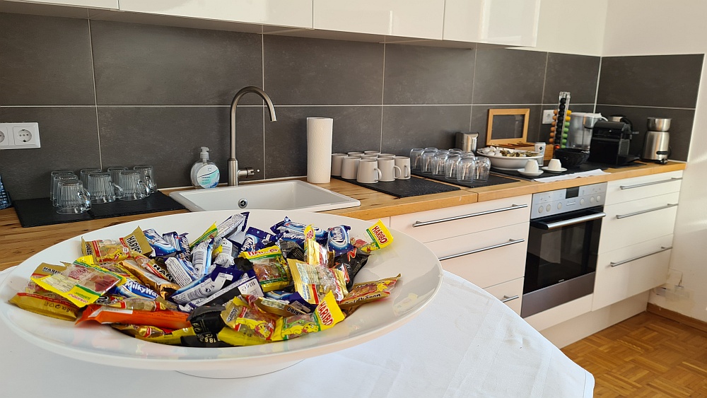 Der große Frühstücksraum sieht aus, als hätte ihn seit Monaten niemand mehr genutzt – der einzige gedeckte Tisch ist der für mich. Und der Einfachheit halber ist das auch keiner am Fenster mit Aussicht, sondern eben der am Eingang zur Küche. Nja… ;)
